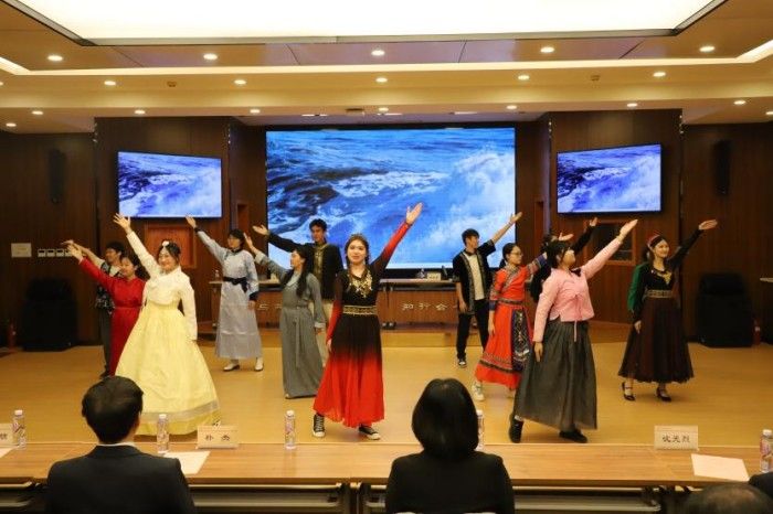学生献上精心编排的舞蹈,获奖学生代表向朴杰董事长赠送手作礼物表达感激。