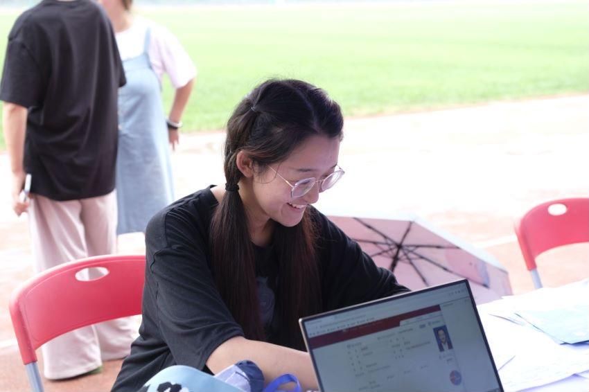 信息录入处,学姐在为萌新们办理入学手续、发放校园卡与开学大礼包等。