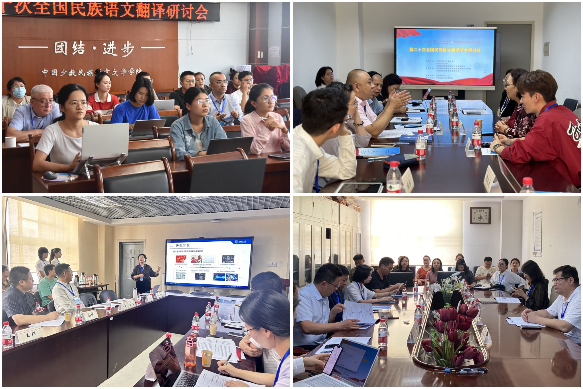、中国民族语文翻译局研究室承办。本次会议围绕“以‘融’为向:新时代民族语文翻译”的主题,共设置开幕式、分组讨论、“主编圆桌会议/期刊约稿会”、闭幕式等环节,来自不同领域、不同学科的50多名专家学者、翻译工作者以及智能翻译技术研发团队代表,共聚一堂,分享铸牢中华民族共同体意识视阈下的新时代民族语文翻译事业发展相关研究成果。本次会议创新会议形式,以书面交流的方式增设了“青年学子论坛”供研究生同学们以文会友,开展学术交流活动。