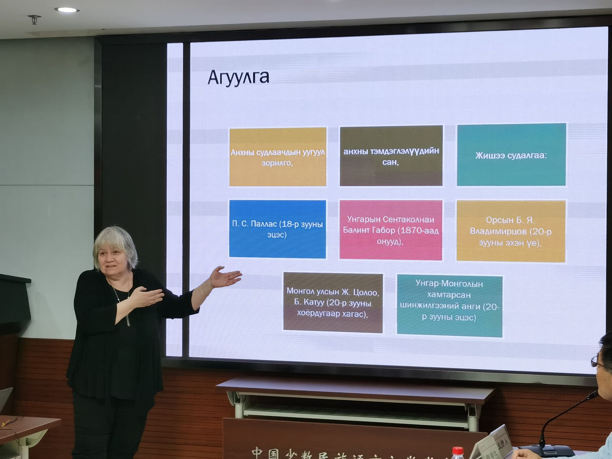 阿格尼希教授学术研究涉及蒙古文献、语言、民俗、传统文化、宗教以及朝鲜语言、宗教和满语等广泛领域。她在学术报告中介绍了十九世纪和二十世纪初匈牙利、德国、俄罗斯等国家学者在蒙古民俗、民间文学领域进行研究的成人小说概况 。其中,重点介绍了匈牙利第一位蒙古学学者巴林特· 嘎布尔(Blint Gabor)和德国学者帕拉斯(eter Simon Pallas)、苏俄学者弗拉基米尔佐夫(Boris Y.Vladimirsov)在19世纪和20世纪初赴喀尔喀、卡尔梅克等地搜集蒙古民俗、民间文学、语言、文化等方面的资料,并进行整理研究的历史和方法。阿格尼希教授还展示了学者们记录留存的部分资料,认为他们是欧洲蒙古学最初的一批真正意义上的学者,为之后的国际蒙古学发展奠定了基础,他们搜集并保存至今的包括喀尔喀、卡尔梅克、布里亚特民间文学、口语方面的文本资料一定程度上撑起了在欧洲的蒙古民俗、民间文学、语言方面的研究,目前为止,这些资料中的一部分已经形成语料库公开于学界,分析研究方面也取得了不少成果,但依然具有不菲的研究价值和空间。