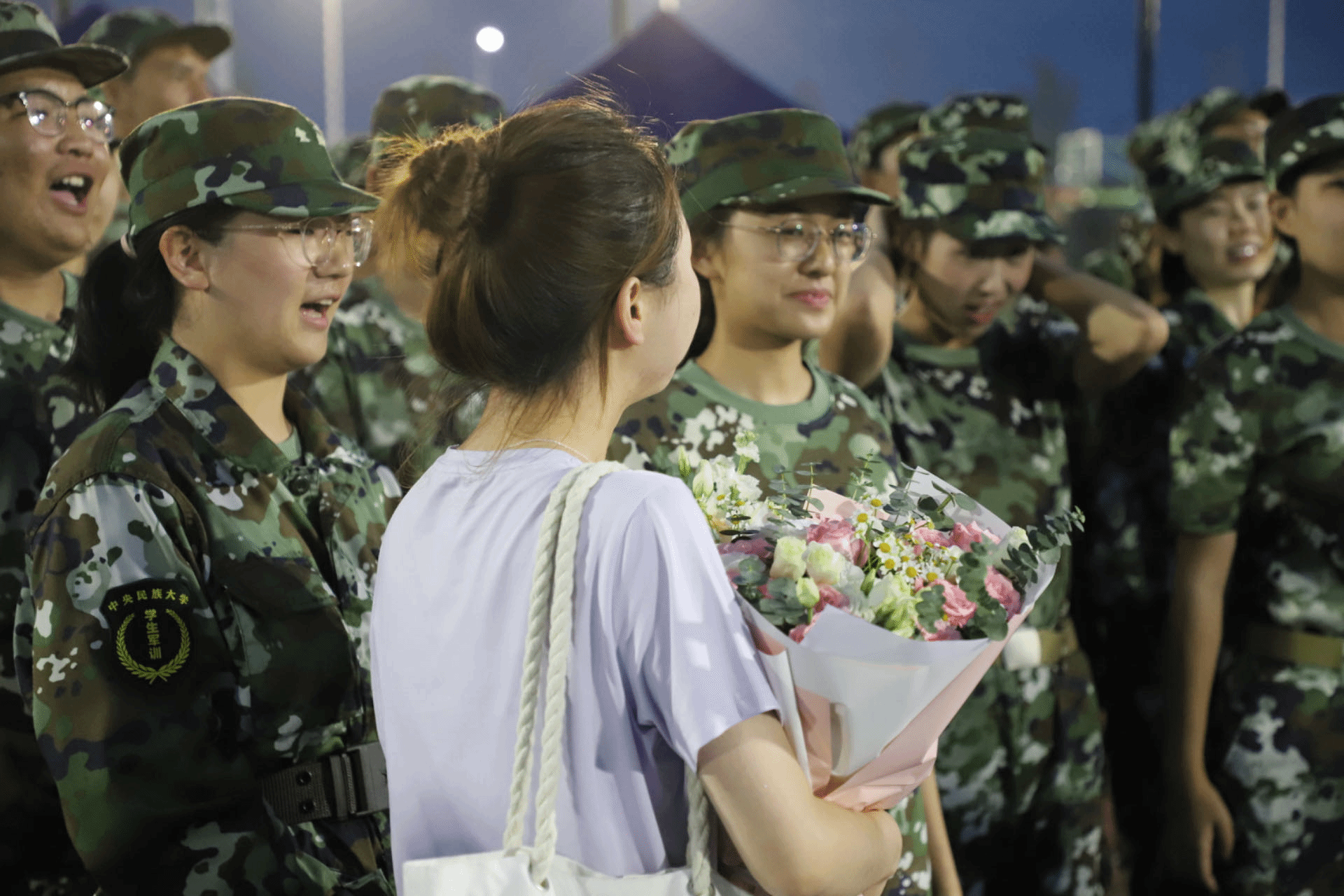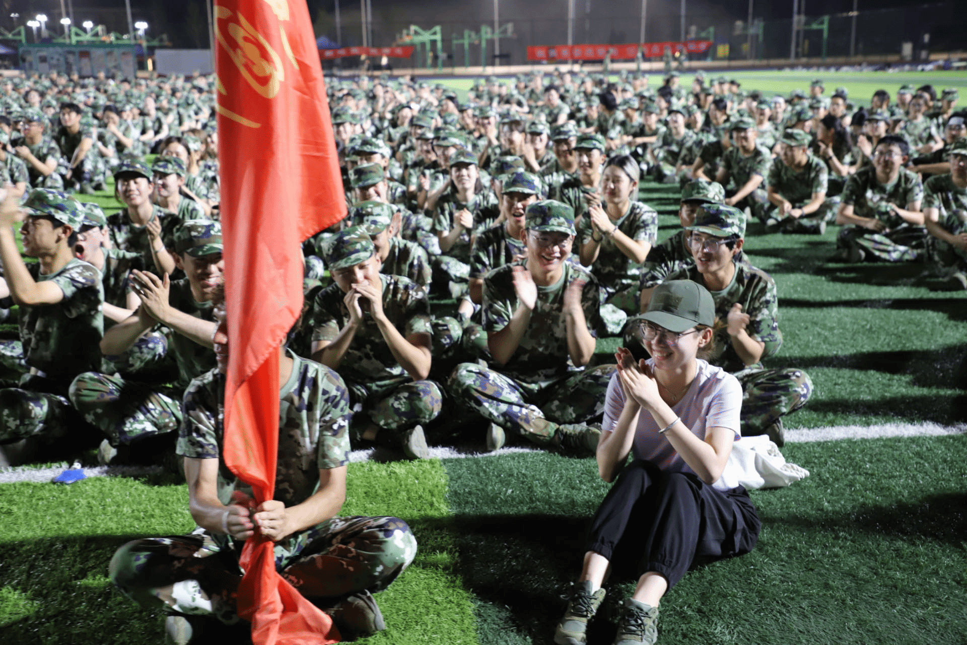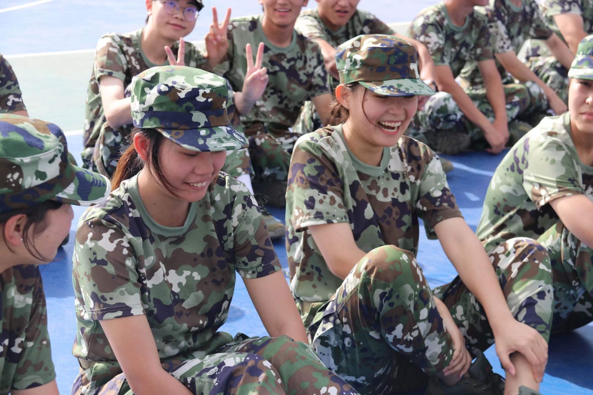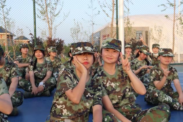 训练中,时常有同学跟不上进度,需要单独加练。教官将动作分解后让他跟着学,却依然漏洞百出,躬身、缩腿,一个十分滑稽的动作逗笑了所有人,就连在一旁板着脸、努力严肃的教官也开始偏头“咳嗽”。傍晚夕阳的余晖洒在脸上,我们的笑容格外灿烂。