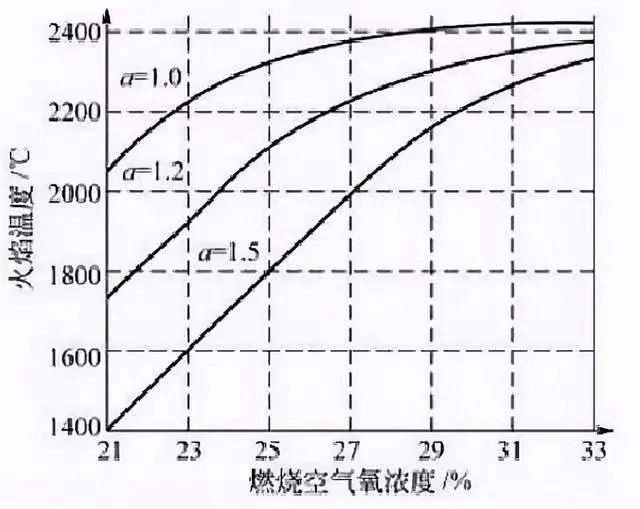 当代人认识到氧气的供应量对炉温的影响,并制作出相应的曲线。从下图可以看出,在氧含量30%以下这个区段,每提高2%的氧含量,差不多可以提高200℃炉温,所以氧含量的贡献非常大。古人是怎么发现用鼓风的办法来提高炉温,就不得而知了。
